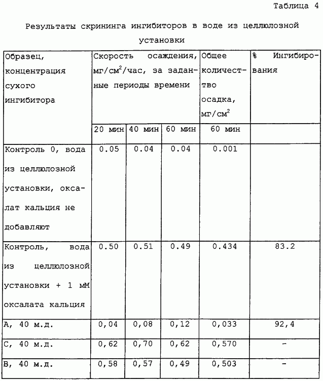Исследуемые растворы содержат 1 мМ (128 м.д.) добавленного оксалата кальция. Оксалат натрия (0,107 г) и дигидрат хлорид кальция (0,118 г) по отдельности растворяют в 400 мл воды из целлюлозной установки. 0,1 н. НСl добавляют к образцам для поддержания рН примерно при значении 2,5. Растворы смешивают и используют в качестве контроля, без ингибитора, или с ингибиторами, для скрининга. Необходимо отметить, что реальная вода из целлюлозной установки, как правило, характеризуется присутствием разнообразных органических материалов, которые могут действовать в качестве природных ингибиторов образования накипи. Настоящая вода из целлюлозной установки также содержит видимые мелкие частицы целлюлозы. Эксперименты повторяют с использованием воды из целлюлозной установки, отфильтрованной с помощью вакуума через стеклянный фильтр для удаления мелких частиц целлюлозы. Результаты хорошо согласуются с теми, которые получены ранее с использованием исходной нефильтрованной воды из целлюлозной установки.