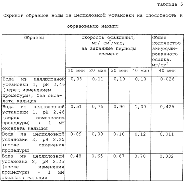 Разнообразные ингибиторы образования накипи оксалата кальция подвергаются скринингу с использованием способа и устройства по настоящему изобретению. Исследования осуществляются при объемном значении рН 2,4-2,7 на нефильтрованной воде из целлюлозной установки (стоки от отбелки), в которую вбрасывают 1 мМ оксалата кальция. Никакого осаждения оксалата кальция из исходной воды из целлюлозной установки не наблюдается, а оксалат вводится в систему перед экспериментами.