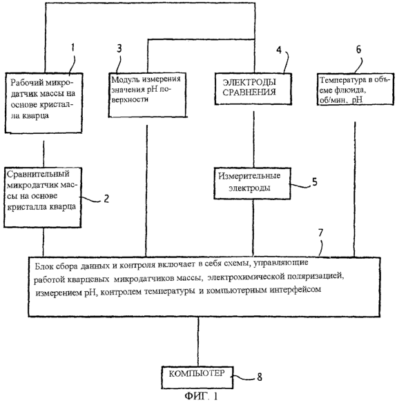 Блок-схема воплощения устройства по настоящему изобретению представлена на фиг.1. Устройство состоит из рабочего микродатчика (1) массы на основе кристалла кварца при необходимости, сравнительного микродатчика (2) массы на основе кристалла кварца, модуля (3) измерения значения рН поверхности, электродов (4) сравнения и измерительных электродов (5), средства (6) для контроля и измерения температуры в объеме раствора, потока раствора и рН, и блока (7) сбора данных и контроля, соединенного с внешним компьютером (8).