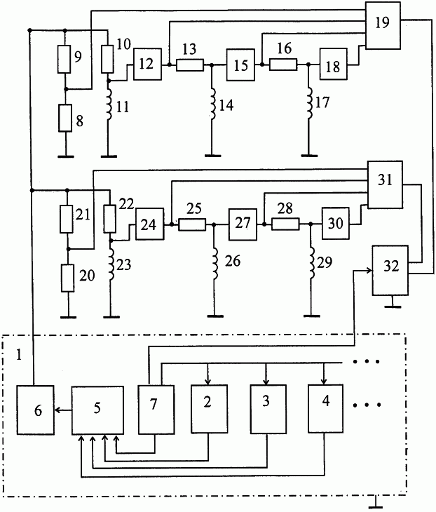 Сущность изобретения поясняется чертежом. Мостовое устройство для определения сопротивлений n резистивных датчиков содержит генератор импульсов 1, который состоит из требующегося числа формирователей импульсов с изменением напряжения в течение их длительности по закону степенных функций, в частности формирователя последовательности прямоугольных импульсов 2 (K0t0), формирователя последовательности импульсов линейно изменяющегося напряжения 3 (K1t1), формирователя последовательности квадратичных импульсов 4 (K2t2) и т.д. В генератор также входит коммутатор 5, усилитель мощности 6 и блок синхронизации 7. Общая шина генератора соединена с землей. Выход усилителя мощности 6 образует первый выход генератора 1. а один из выходов блока синхронизации 7 – второй выход (выход синхронизации). Первая ветвь электрического моста включает в себя одиночный резистор 8 (R8), регулируемый резистор 9 (R9) и сложную цепь, состоящую из регулируемого резистора 10 (R10), катушки индуктивности 11 (L11), усилителя напряжения 12. регулируемого резистора 13 (R13), катушки индуктивности 14 (L14), усилителя напряжения 15, регулируемого резистора 16 (R16), катушки индуктивности 17 (L17), усилителя напряжения 18, аналогового сумматора 19. Выход аналогового сумматора 19 образует один из выводов выхода моста. Вторую ветвь моста образуют одиночный резистор 20 (R20), резистивный датчик 21 (R21) и сложная цепь, состоящая из резистивного датчика 22 (R22), катушки индуктивности 23 (L23), усилителя напряжения 24, резистивного датчика 25 (R25), катушки индуктивности 26 (L26), усилителя напряжения 27, резистивного датчика 28 (R28), катушки индуктивности 29 (L29), усилителя напряжения 30, аналогового сумматора 31. Пара усилителей 12 и 24 имеют одинаковый коэффициент усиления, равный k1 пара усилителей 15 и 27 имеют одинаковый коэффициент усиления, равный k2, а пара усилителей 18 и 30 имеют одинаковый коэффициент усиления, равный k3. Выход аналогового сумматора 31 образует второй вывод выхода моста. Первый вход (дифференциальный вход) нуль-индикатора 32 соединен с выходом моста, а второй вход его (вход синхронизации) – со вторым выходом генератора 1 импульсов.