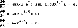 Площадь F соприкосновения рабочей поверхности барабана смесителя с загруженной в барабан смесьюF = 2 R2(1-k2)+2 RL,где k=r/R; r – радиус внешнего слоя загрузки барабана, соприкасающийся с поверхностью крышек барабана. Радиус r внешнего слоя загрузки барабана определяется исходя из требуемого заполнения барабана смешиваемым материалом. Зависимость между радиусом r внешнего слоя и степенью заполнения барабана определяется по известной формуле Канторовича-Осецкого, что, в свою очередь, определяет диаметр (радиус) загрузочно-разгрузочного отверстия в соотношении 0,28 от внутреннего диаметра (радиуса) барабана соответственно. Находят такие значения R и L, при которых рабочая площадь F внутренней поверхности барабана достигает минимума при следующем ограничении: R2,5L= C-const. Решения находят с помощью метода Лагранжа, для чего формируют функцию Лагранжа = 2 R2(1-k2)+2 RL- (R2,5-C),где – множитель Лагранжа.