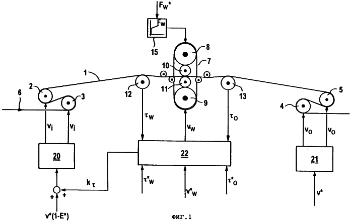 Перед и после дрессировочной прокатной клети 7 предусмотрены ролики для измерения натяжения 12 и 13, которые измеряют натяжение i металлической полосы 1 перед дрессировочной прокатной клетью 7 и натяжение 0 в металлической полосе 1 после дрессировочной прокатной клети 7. Значения i и 0 вместе с их соответствующими заданными значениями i* и 0*, а также с заданным значением w* для скорости vw дрессировочной прокатной клети 7 являются входными величинами для регулятора натяжения 14. Регулятор натяжения 14 регулирует скорость vw дрессировочной прокатной клети 7. Кроме того, регулятор натяжения 14 выдает зависимое от натяжения значение коррекции k .