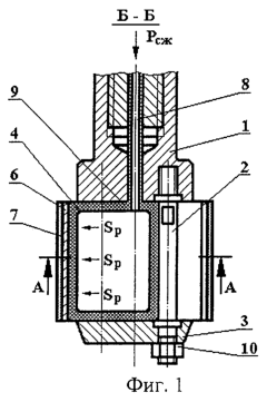 Головка приводится в рабочее состояние путем подачи сжатого воздуха Рсж в упругую оболочку 4 через осевое отверстие 8 в корпусе 1, соединенное с центральным отверстием в торце 9 оболочки 4.