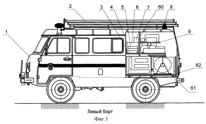 Эта цель достигается за счет того, что кузов снабжен несколькими поперечными замкнутыми кольцевыми рамами, поперечными и продольными силовыми опорами, жестко соединенными между собой, с рамами, с кузовом и являющимися элементами размещения и крепления на них с помощью быстросъемных кронштейнов, ложементов и фиксаторов аварийно-спасательных средств, а соединения некоторых опор выполнены телескопическими, с возможностью изменения их габаритов и снабжены фиксаторами, жестко установленными на силовые опоры и имеющими внутренние поверхности, выполненные эквидистантно конфигурации размещаемых в них аварийно-спасательных средств, а на крыше кузова установлены кронштейн-опрокидыватель, являющийся держателем трехколенной лестницы, и грузовая площадка, жестко связанная с кольцевыми рамами, а также, за счет того, что в кузове установлены стеллажи с полками и отсеками, выполненными из крупной металлической сетки и связанные с силовыми опорами.