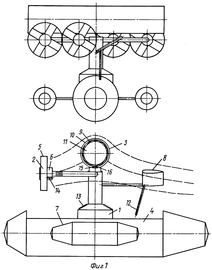 На фиг.1 штриховыми линиями показаны нулевая и граничные линии тока ускоренного винтами потока.