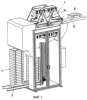При штабелировании ящиков 8, подаваемых порознь другим транспортером 6, подъемник со своими двумя подъемными столами 10, 12 для штабелей работает наоборот.