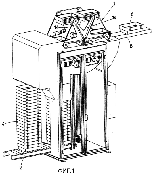 В изображенном на фиг.1 и 2 примере выполнения устройство, согласно изобретению, со своим штабелирующим колесом 1 расположено между транспортером 2 для подачи и отвода штабелей 4 ящиков, с одной стороны, и транспортером 6 для подачи и отвода отдельных ящиков 8, с другой стороны. Помимо более подробно описываемого ниже штабелирующего колеса 1 устройство содержит на конце транспортера 2 для подачи и отвода штабелей 4 ящиков два попеременно работающих подъемника (фиг.2 и 4) для подъема штабелей 4 ящиков настолько, что самый верхний ящик штабеля 4 каждый раз расположен в положении взятия.