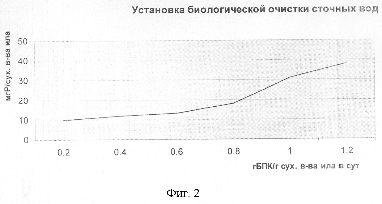 Соотношение размеров трех ступеней относительно друг друга обусловлено следующими обстоятельствами. Экспериментально установлено (фиг.2), что с увеличением суточной нагрузки на биоценоз свободноплавающих микроорганизмов по количеству легкоусваиваемых органических веществ ферментная система гетеротрофных бактерий изменяется по составу, в ней возрастает содержание АТФ (аденозингрифосфорная кислота) и белковое вещество бактерий становится более насыщено фосфором. Уже при нагрузке 1 кг БПКп/кг беззольного вещества микроорганизмов в сутки содержание фосфора в белковой системе ила увеличивается до 30 мг фосфора на 1000 мг сухого вещества ила, в то время как у илов традиционных аэротенков, работающих с традиционными нагрузками 0,2-0,6 кг БПКп/кг беззольного вещества в сутки, содержание фосфора находится в пределах 10-12 мг Р/г сухого вещества.
