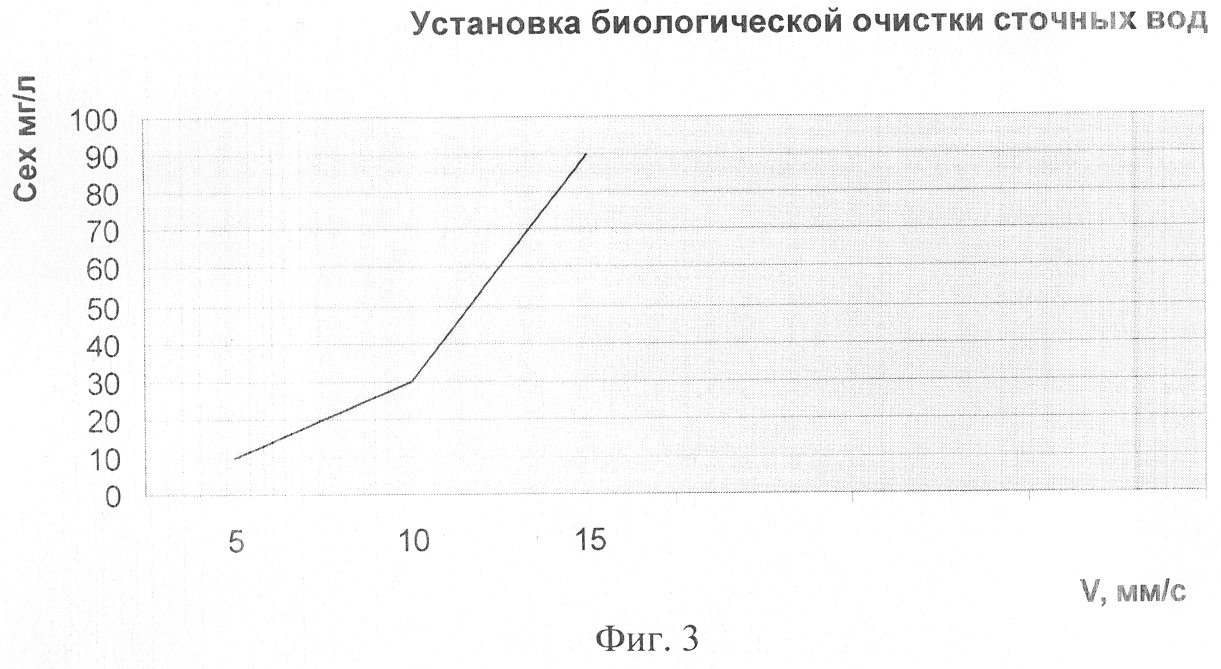 На фиг.3 показано влияние скорости протока очищаемой сточной жидкости между пластин тонкослойного модуля на вынос взвешенных веществ с осветляемой сточной жидкостью. При равенстве расходов сточной жидкости на илоотделителях первой и второй ступени вынос взвешенных веществ из илоотделителей первой ступени обязательно будет больше выноса взвешенных веществ из илоотделителей второй ступени, поэтому в первой ступени концентрация ила обязательно будет ниже, чем концентрация ила во второй ступени. А, следовательно, всегда будет соблюдаться соотношение нагрузок на ил первой и второй ступеней.