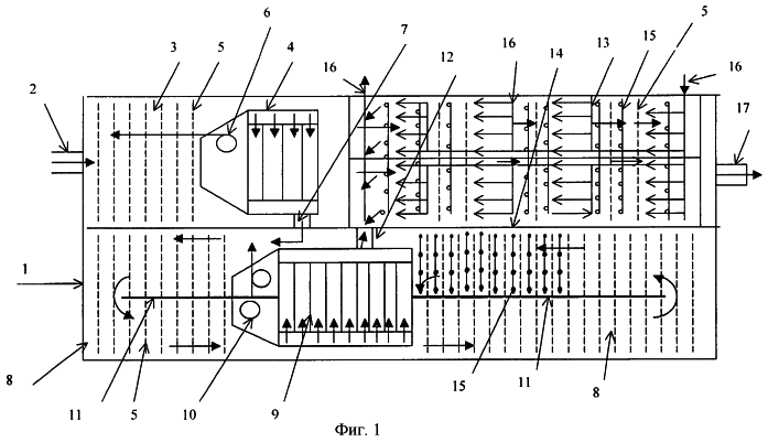 По днищу резервуара 1 в третьей 13 ступени биореакторов смонтирована гидромеханизированная система коммуникаций 16 для выведения осадков сточных вод из резервуара 1 на сгущение и обезвоживание. По днищу резервуара 1 в третьей 13 ступени уложены барботеры 5 аэрации.