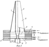 1. Устройство подачи расплава горных пород или стекла и формования непрерывных волокон, включающее электрообогреваемый полый элемент, токоподводы, пару верхних и пару нижних зажимов токоподводов и формующее устройство со стыковочным фланцем в верхней части корпуса, отличающееся тем, что нижний токоподвод питающего устройства является элементом, контактирующим со стыковочным фланцем формующего устройства, а пара нижних зажимов токоподводов несет на себе функцию холодильника, обеспечивающего герметичность между нижним токоподводом и фланцем формующего устройства, причем расстояние от внешней кромки стыковочного фланца формующего устройства до внутренней кромки нижнего зажима токоподводов находится в пределах 2÷25 мм.