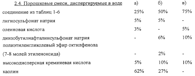 Активный ингредиент тщательно смешивают с адъювантами и смесь тщательно измельчают в соответствующей мельнице, получая смачивающиеся порошки, которые можно разводить в воде с получением суспензий любой требуемой концентрации.