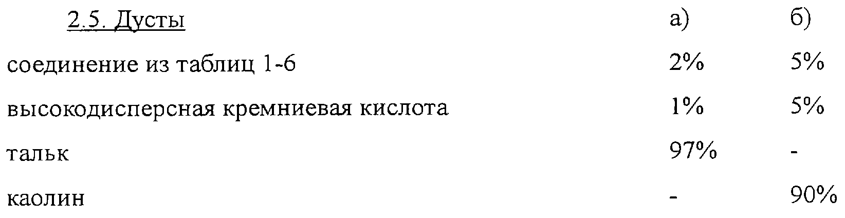 Готовые к применению дусты получают гомогенным смешением носителей с активным ингредиентом и измельчением полученной смеси.