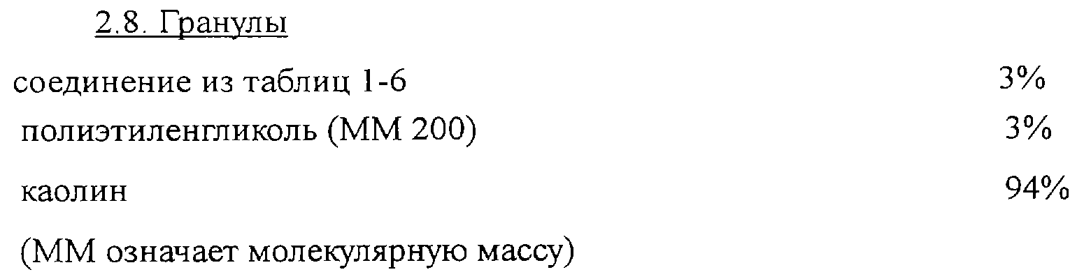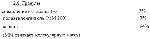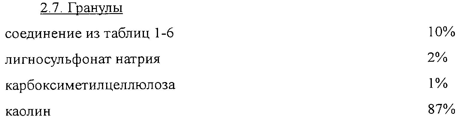 В этом опыте соединения из таблиц 1-6 проявили хорошую активность. Так, в частности, соединения 3.12, 3.13, 3.15, 3.20, 3.21, 3.107-3.109 и 3.112 приводят к уменьшению популяции вредителей более чем на 80%.
