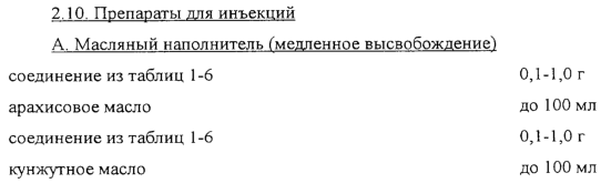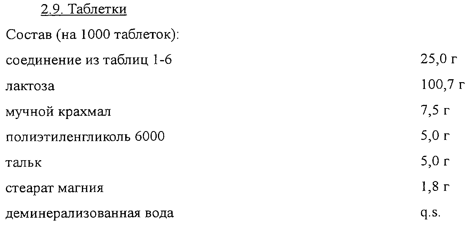 Сначала все твердые компоненты просеивают через сито с размером ячеек 0,6 мм. Затем активный ингредиент смешивают с лактозой, тальком и половиной количества крахмала. Вторую половину от всего количества крахмала суспендируют в 40 мл воды и полученную суспензию добавляют к кипящему раствору полиэтиленгликоля в 100 мл воды. Полученную крахмальную пасту добавляют к основной смеси, после чего смесь гранулируют, при необходимости с добавлением воды. Гранулы сушат в течение ночи при 35°С, просеивают через сито с размером ячеек 1,2 мм, смешивают со стеаратом магния и прессуют двояковогнутые таблетки диаметром примерно 6 мм.