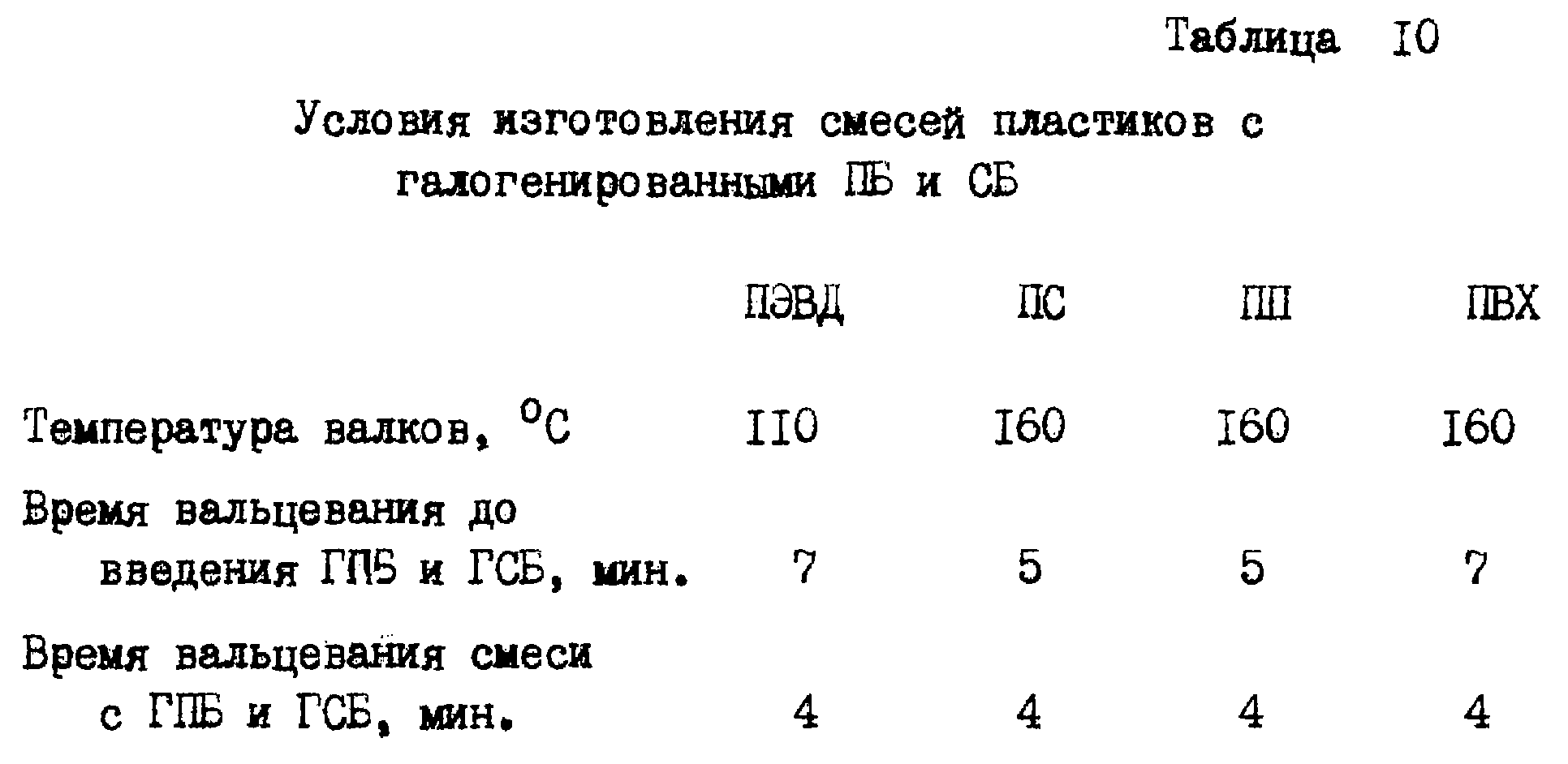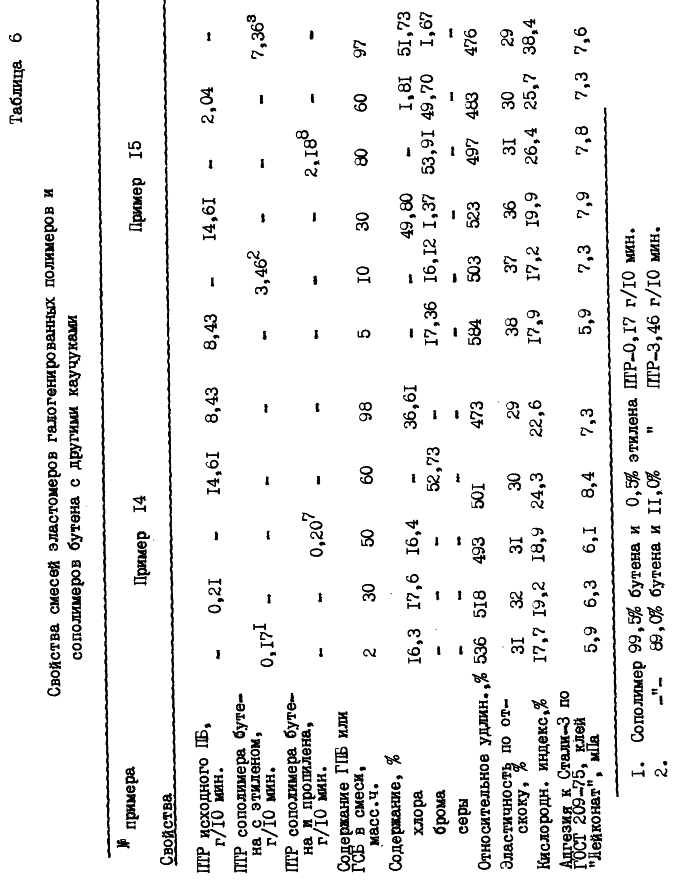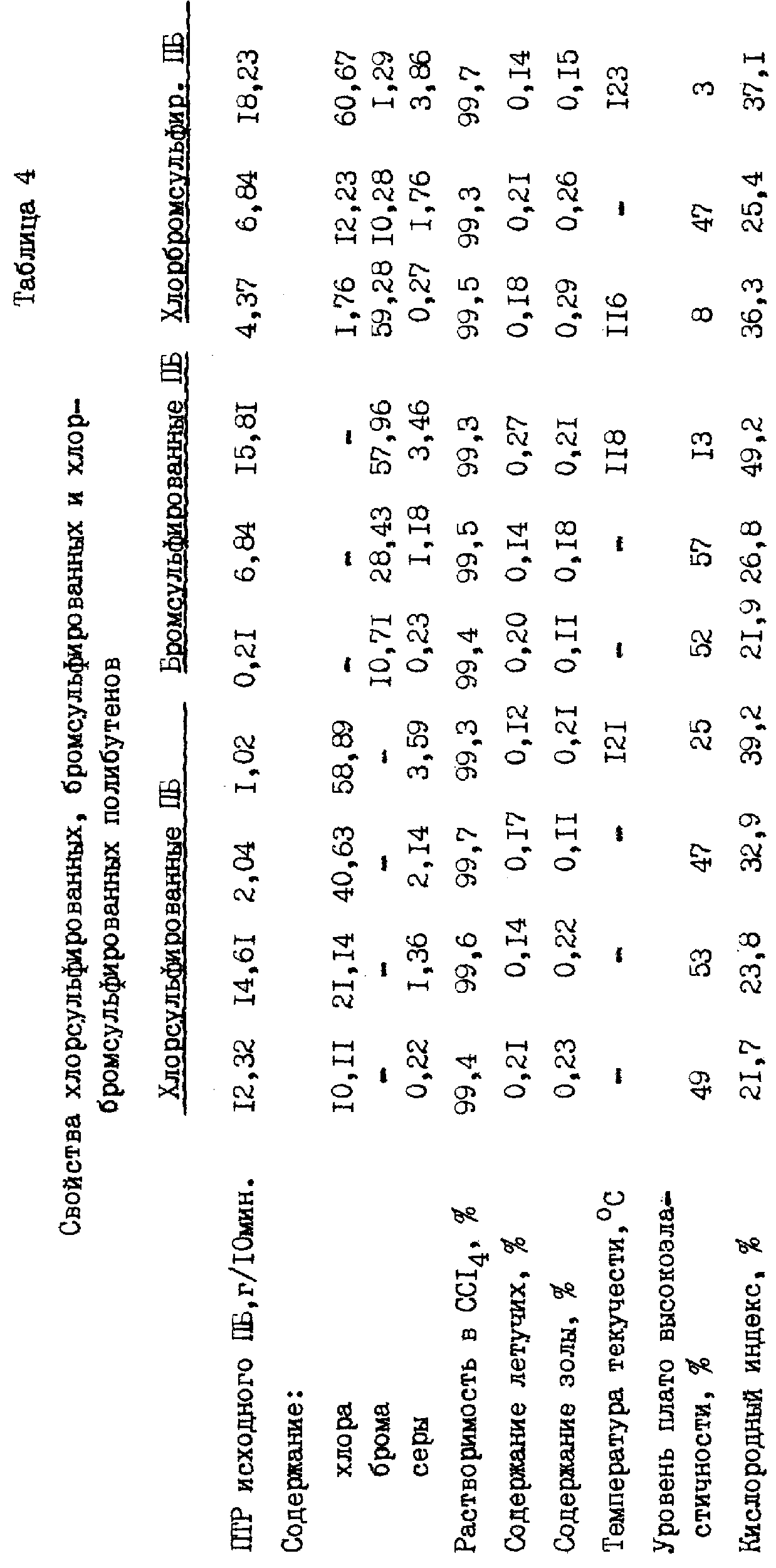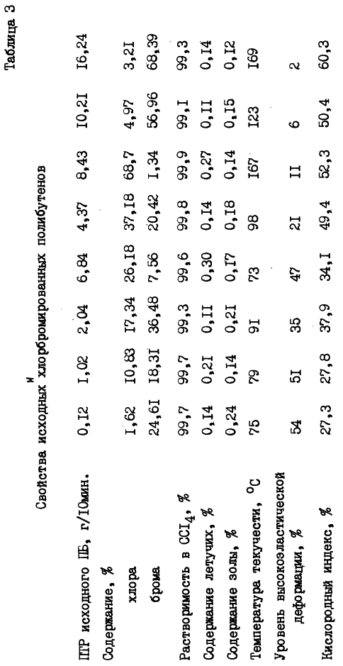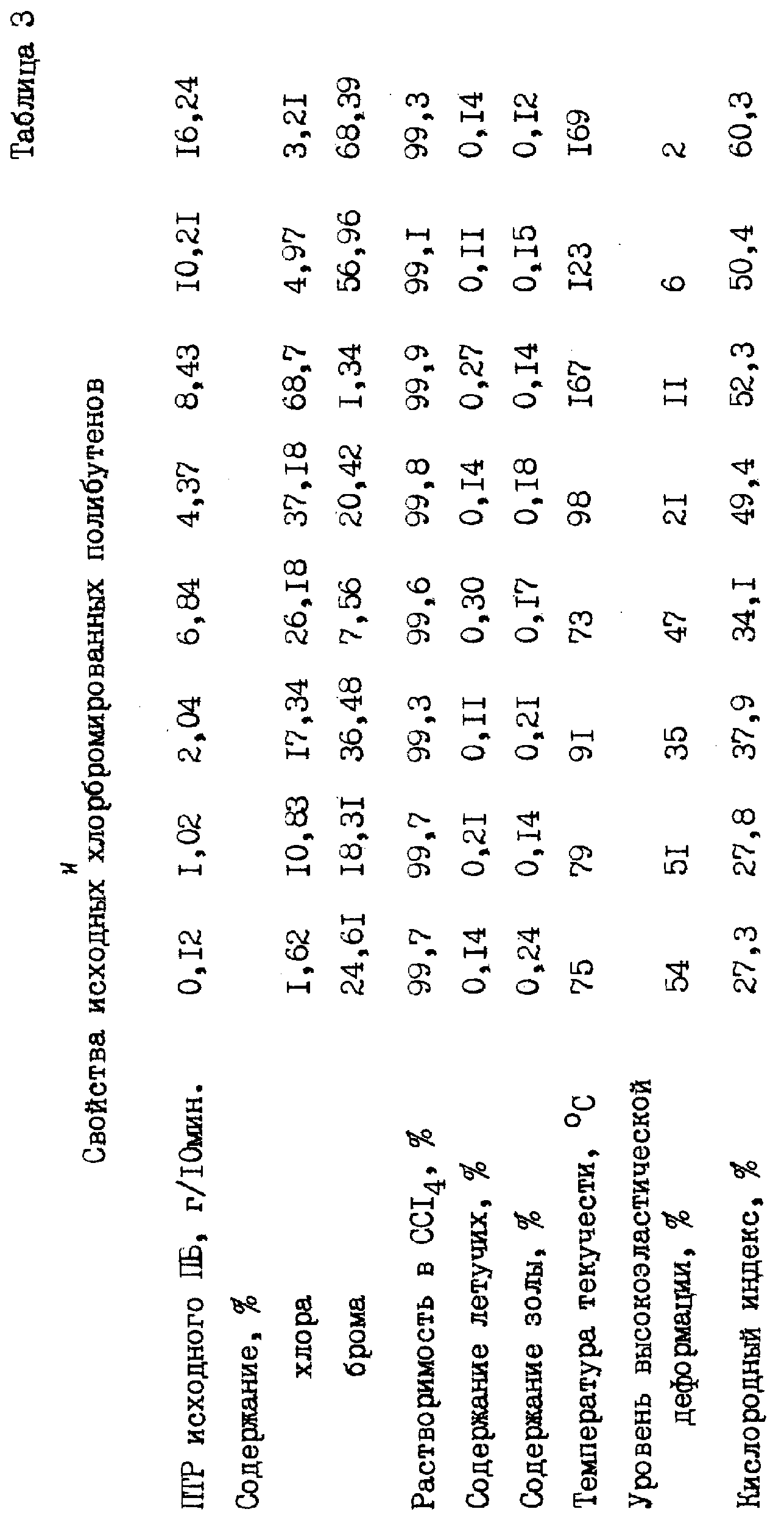 Хлорирование, бромирование, хлорбромирование, хлорсульфирование, бромсульфирование и хлорбромсульфирование ПБ с ПТР-0,14-15,6 г/10 мин проводили в растворе хлорсодержащих растворителей (тетрахлорэтан или хлорбензол) на установке, состоящей из 2-х литрового круглодонного реактора, снабженного барботером для подачи из баллонов газообразного хлора и газообразного сернистого ангидрида, мешалкой, конденсатором, соотвтствующей арматурой и коммуникаций. Абгазы нейтрализовали в поглотительной колонне.