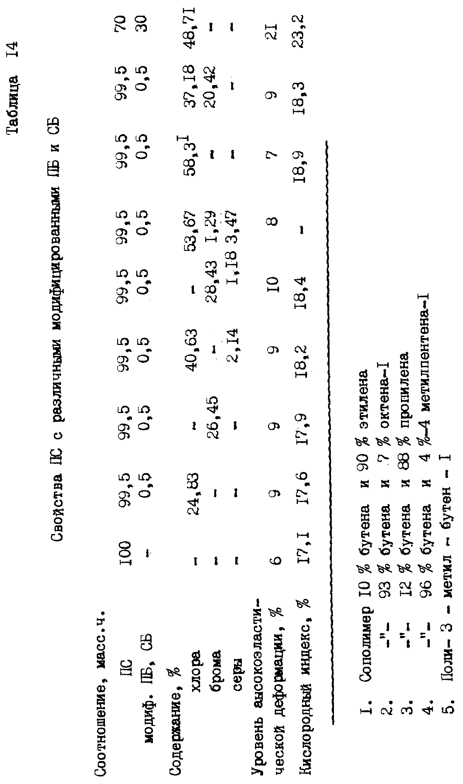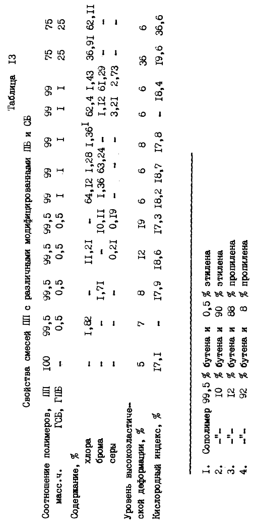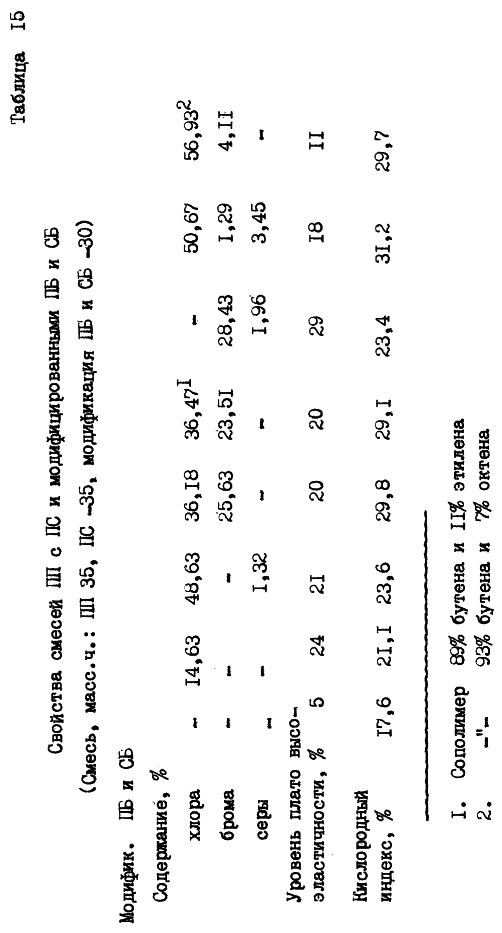 Полибутены и СБ известные полимеры класса полиолефинов и по объему производства находятся на 3-м месте после ПЭ и полипропилена. Отличием ПБ и СБ является то, что их прочность составляет 29-26 мПа, в то время как прочность ПЭВД 10-12 мПа. Это отличие. а также строение цепи ПБ и СБ позволило достичь повышенную прочность, эластичность и огнестойкость модифицированных ПБ и СБ и их смесей с другими полимерами, о чем свидетельствуют приведенные ниже примеры.