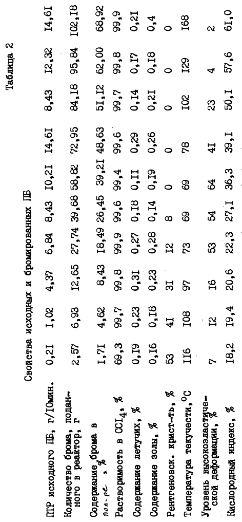 При бромировании, хлорбромировании и бромсульфировании жидкий бром вводили непосредственно в реактор через капельную воронку. Сернистый ангидрид подавали из баллона через барботер. Хлорбромирование ПБ и СБ получали бромированием полимеров в растворе с жидким бромом, а затем хлорированием газообразным хлором.