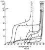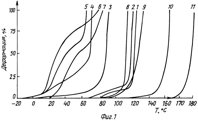 Фиг.1. Термомеханические кривые исходного (1) и галогенированных ПБ с содержанием хлора, %: 2-1,52 (брома 1,71);3-7,70 (брома 8,43); 4-13,16; 5-23,54 (брома 26,45); 6-40,42 (брома 44,68 и серы 1,32); 7-54,43; 8-61,83 (брома 61,93 и хлора 1.87); 9 63,83 (брома 66,82); 10-69,71; 11-72,93.