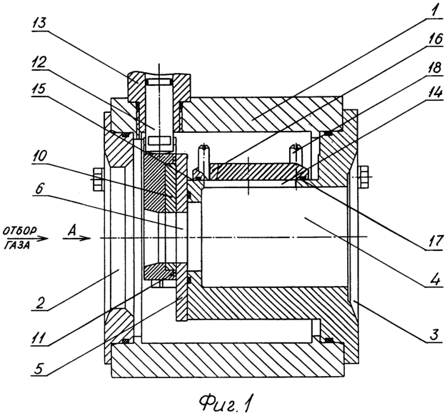 Предлагаемое изобретение изображено на чертеже, где на фиг.1 изображен продольный разрез устройства в открытом положении при отборе газа из скважины, на фиг.2 – вид А на фиг.1 (крышка снята).