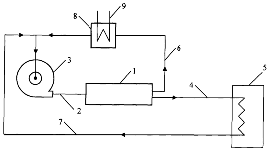 Теплоноситель поступает в вихревую трубу 1 по напорному трубопроводу 2 с помощью нагнетателя теплоносителя 3. Горячий поток разделенного в вихревой трубе на горячий и холодный потоки теплоносителя по трубопроводу горячего потока 4 поступает потребителю 5, а холодный поток по трубопроводу холодного потока 6 поступает во всасывающий патрубок нагнетателя теплоносителя 3, причем холодный поток теплоносителя проходит через теплообменник 8, в который по трубопроводу 9 поступает теплоноситель внешнего источника низкопотенциальной теплоты, тем самым утилизируется теплота низкопотенциального источника теплоты. Охлажденный у потребителя теплоноситель по обратному трубопроводу 7 поступает во всасывающий патрубок нагнетателя теплоносителя 3.