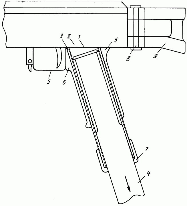 1. Устройство для установки сошки в оружии, имеющем ствольную коробку, спусковую скобу и приклад, содержащее рукоять управления оружием, внутри которой размещена телескопическая сошка с охватывающей и охватываемой составляющими, отличающееся тем, что охватываемая составляющая выполнена винтовой, верхний торец охватывающей составляющей неразъемно соединен с нижней казенной частью ствольной коробки позади спусковой скобы, при этом рукоять управления выполнена в виде термоизолирующих накладок для охватывающей составляющей сошки.