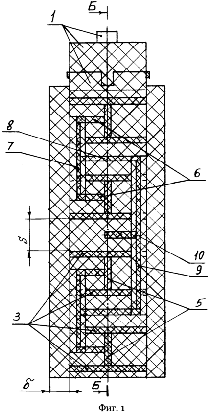 На фиг.1 изображена схема устройства для формирования взрывной волны, на фиг.2 – разрез по Б-Б. Устройство (см. фиг.1 и фиг.2) содержит источник инициирования 1, основной заряд ВВ 2, выполненный в виде полого цилиндра, дисков 3 заряда ВВ, диэлектрика 4, расположенного между дисками 3, элементы которого имеют толщину, не превышающую величину .