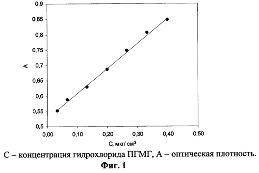 На фиг.1 изображен градуировочный график для определения концентрации гидрохлорида ПГМГ в воде согласно примеру 1.