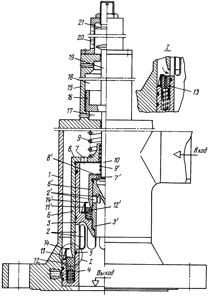 На чертеже показан общий вид регулятора давления газа в виде продольного разреза с выносным элементом I. При этом обращаем внимание на то, это номера позиций со штрихом относятся ко второму запорному органу.