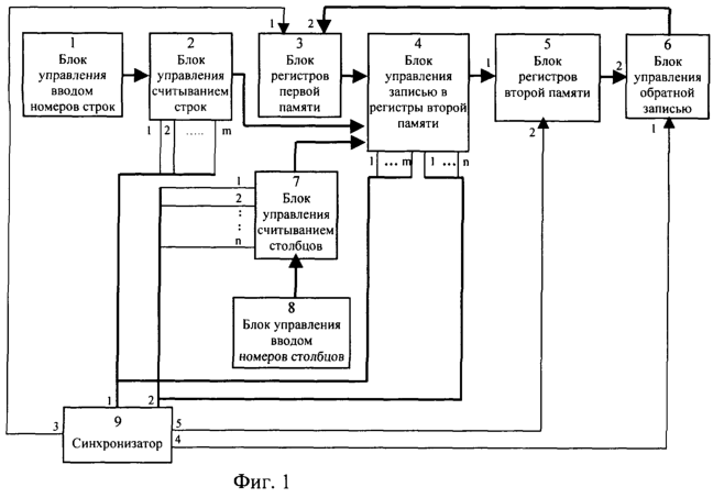 На фиг.1 представлена функциональная схема устройства, здесь 1 – блок управления вводом номеров строк, 2 – блок управления считыванием строк, 3 – блок регистров первый памяти, 4 – блок управления записью в регистры второй памяти, 5 – блок регистров второй памяти, 6 – блок управления обратной записью, 7 – блок управления считыванием столбцов, 8 – блок управления вводом номеров столбцов, 9 – синхронизатор. Показана полная конфигурация устройства, при этом для наглядности блоки управления вводом номеров столбцов и строк вынесены из блоков управления считыванием столбцов и строк. Жирными линиями показаны общие шины, содержащие несколько отдельных соединений. Так шина между блоками 6 и 3 содержит mn отдельных каналов передачи сигналов, шина между блоками 2 и 4 содержит m соединений, шина между 7 и 4 содержит n соединений, шина между 1 и 2 содержит m2 соединений, шина между 8 и 7 содержит n2 соединений, между блоками 4 и 5 – mn соединений, также между 5 и 6 и между 3 и 4 – по mn соединений. С выхода 3 блока 9 подается сигнал обнуления блока 3, с выхода 4 – второй сигнал записи (обратной), с выхода 5 – сигнал обнуления блока 5.
