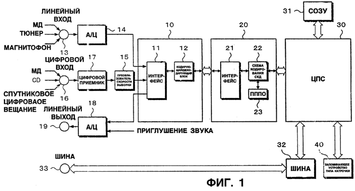 Закодированные аудиоданные, которые считываются из запоминающего устройства 40 типа карточки с помощью ЦПС 30, декодируются в микросхеме 20 безопасности. Звуковое кодирующее/декодирующее устройство 10 декодирует закодированные данные, соответствующие формату ATRAC3. Выходные звуковые данные кодирующего/декодирующего устройства 10 подаются в Ц/А: преобразователь 18. Ц/А преобразователь 18 преобразует выходные данные звукового кодирующего/декодирующего устройства 10 в аналоговый сигнал. Аналоговый звуковой сигнал подается на вывод 19 линейного выхода.