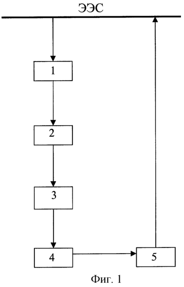 На фиг.1 аббревиатурой ЭЭС обозначена электроэнергетическая система; блок 1 иллюстрирует устройства сопряжения электроэнергетической системы и средств вычислительной техники; блок 2 представляет аналого-цифровой преобразователь; в блоке 3 осуществляется разложение напряжения и тока на гармонические составляющие; блок 4 включает в свой состав процессор, где и осуществляется оценка уровня импульсов напряжения и тока и, при необходимости, формируются сигналы управления корректирующими устройствами; блок 5 иллюстрирует сами корректирующие устройства, активно воздействующие на электроэнергетическую систему с целью уменьшения импульсов напряжения и тока.
