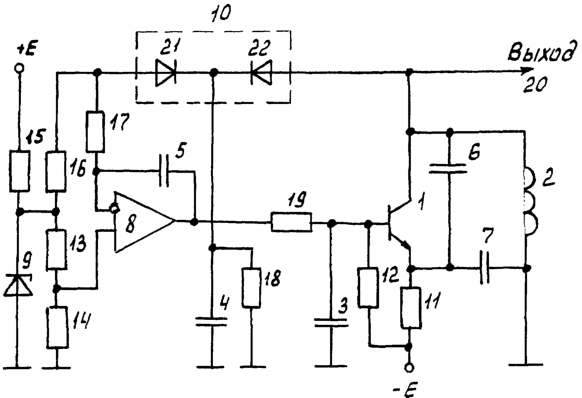 К коллектору транзистора 1 подключена одним выводом катушка 2 индуктивности, другим выводом подключенная к общему проводу. Эмиттер транзистора 1 подключен через конденсатор 6 к коллектору транзистора 1, через конденсатор 7 к общему проводу, через резистор 11 к отрицательному полюсу источника питания. База транзистора 1 соединена через резистор 12 с отрицательным полюсом источника питания, через конденсатор 3 с общим проводом, через резистор 19 с выходом ОУ 8, неинвертирующий вход которого соединен со средней точкой последовательно соединенных резисторов 13 и 14, подключенных параллельно стабилитрону 9, анод которого соединен с общим проводом, катод соединен через резистор 15 с положительным полюсом источника питания и через последовательно соединенные резисторы 16 и 17 с инвертирующим входом ОУ 8, средняя точка резисторов 16 и 17 соединена с анодом первого диода 21 диодной сборки 10, катод которого соединен с катодом второго диода 22, соединенного анодом с коллектором транзистора 1, а точка соединения диодов 21 и 22 соединена через параллельно включенные резистор 18 и конденсатор 4 с общим проводом, выход ОУ 8 соединен через конденсатор 5 с его инвертирующим входом.