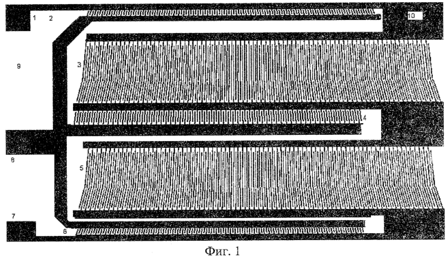 На фиг.1 представлен эскиз топологии импедансного режекторного фильтра на ПАВ, где: