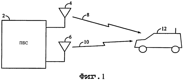 Настоящее изобретение проиллюстрировано на фиг.1 в контексте системы радиосвязи. Подсистема приемопередатчика базовой станции (ПБС) 2 содержит две передающие антенны 4 и 6, которые используются для передачи сигналов по двум передающим каналам 8 и 10 в сторону абонентской станции 12. Настоящее изобретение применимо к любой системе связи, использующей передачу с разнесением. В данном примерном варианте осуществления изобретения сигналы, передаваемые с подсистемы приемопередатчика базовой станции (ПБС) 2, являются сигналами связи многостанционного доступа с кодовым разделением каналов. Специалистам в данной области техники будет понятно, что ПБС можно заменить абонентской станцией, сконцентрированной относительно локального радиошлейфа (АСЛШ), или любым другим передатчиком, использующим разнесенную передачу, не выходя за рамки объема изобретения. Формирование и передача сигналов связи многостанционного доступа с кодовым разделением каналов хорошо известны и подробно описаны в упомянутом патенте США №5103459 и в описании стандарта IS-95. Настоящее изобретение может также найти применение в системах связи многостанционного доступа с частотным разделением каналов (МДЧР) и системах связи многостанционного доступа с временным разделением каналов (МДВР), таких как система связи GSM и предложенные системы связи МДВР третьего поколения, называемые все вместе EDGE.