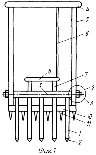 От указанного недостатка свободно устройство для обработки почвы по патенту Российской Федерации №2097950 (опубл. 10.12.97 г.). Это устройство для обработки почвы имеет зубцы с острым углом при вершине, расположенные в один ряд и объединенные в верхней части общей перемычкой, ручку, над перемычкой в одной плоскости с зубцами установлена педаль с осями, жестко соединенными с указанной перемычкой и шарнирно со стойкой. Данное устройство для обработки почвы наиболее близко к предлагаемому.