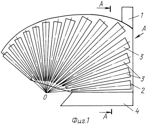 Для снижения энергоемкости вспашки, улучшения качества оборота пласта и повышения надежности работы конструкции весь отвал выполнен с прорезями, в которые установлены цельно-конические ротационные элементы, оси их вращения расположены веером, а продолжения осей вращения пересекаются в точке 0.