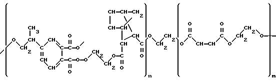 (57) Реферат: Описывается новая герметизирующая композиция, содержащая полисульфидный олигомер, наполнитель, диоксид марганца, пластификатор, стеариновую кислоту, аэросил, дифенилгуанидин и модифицирующую добавку. В качестве модифицирующей добавки она содержит ненасыщенную полиэфирную смолу, полученную поликонденсацией смеси ангидрида норборнендикарбоновой кислоты и малеинового или фталевого ангидрида при их мольном соотношении 4 : 6 со смесью этиленгликоля или пропиленгликоля и диэтиленгликоля, при их мольном соотношении 3 : 7, при мольном соотношении ангидридов кислот и гликолей 1 : 1, при следующем соотношении компонентов, мас.ч.: полисульфидный олигомер 100, наполнитель 83,43 – 142, диоксид марганца 6,2 – 10, пластификатор 7,19 – 15, стеариновая кислота 0,13 – 0,7, аэросил 0,55 – 4,34, дифенилгуанидин 0,2 – 1,5, указанная модифицирующая добавка 0,5 – 5. Технический результат – повышение адгезии герметика на основе заявляемой герметизирующей композиции к стеклу и дюралю при сохранении физико-механических свойств. 2 табл. Изобретение относится к композициям на основе полисульфидных олигомеров (жидких тиоколов) и может быть использовано в строительстве для герметизации стеклопакетов. Известна герметизирующая композиция, содержащая полисульфидный олигомер, технический углерод, вулканизующий агент – смесь диметиламинометилфенол и ускоритель вулканизации олигодиэтиленмалеинат при следующем соотношении компонентов, мас.ч.: полисульфидный олигомер – 100 технический углерод – 30-50 олигодиэтиленмалеинат – 20-30 смесь диметиламинометилфенол – 1 – 2, (см. RU Патент 2101316, кл. C 09 K 3/10, 1996). Недостатком известной композиции является то, что она не обладает достаточной адгезией к стеклу и дюралю. Наиболее близкой по технической сущности является герметизирующая композиция, содержащая: полисульфидный олигомер; наполнитель – сажу; диоксид марганца; пластификатор – дибутилфталат; стеариновую кислоту; аэросил; дифенилгуанидин; модифицирующую добавку – , – метакрилбиспентаэритритадипинат, при следующем соотношении, мас.ч.:полисульфидный олигомер – 72-82 сажа – 18-28 диоксид марганца – 4.999-6.666 дибутилфталат – 3.829-5.101 стеариновая кислота – 0.02 – 0.028 аэросил – 0.149-0.199 дифенилгуанидин – 0.6-1.0 , – метакрил-бис-пентаэритритадипинат – 3.0 – 7.5,(см. Авторское свидетельство СССР 584027, кл. C 09 J 3/12, C 09 K 3/10, 1976). Недостатком данной герметизирующей композиции является невозможность достижения адгезии к стеклу и дюралю, обеспечивающей необходимые эксплуатационные свойства. Задачей изобретения является повышение адгезии герметика на основе заявляемой герметизирующей композиции к стеклу и дюралю при сохранении физико-механических свойств. Техническая задача решается тем, что герметизирующая композиция, содержащая полисульфидный олигомер, наполнитель, диоксид марганца, пластификатор, стеариновую кислоту, аэросил, дифенилгуанидин и модифицирующую добавку, в качестве модифицирующей добавки она содержит ненасыщенную полиэфирную смолу, полученную поликонденсацией смеси ангидрида норборнендикарбоновой кислоты и малеинового или фталевого ангидрида при их мольном соотношении 4:6 со смесью этиленгликоля или пропиленгликоля и диэтиленгликоля, при их мольном соотношении 3:7, при мольном соотношении ангидридов кислот и гликолей 1: 1, при следующем соотношении компонентов ко