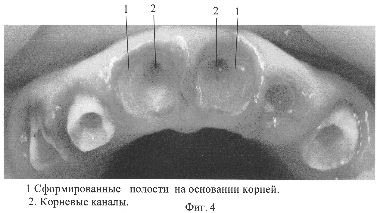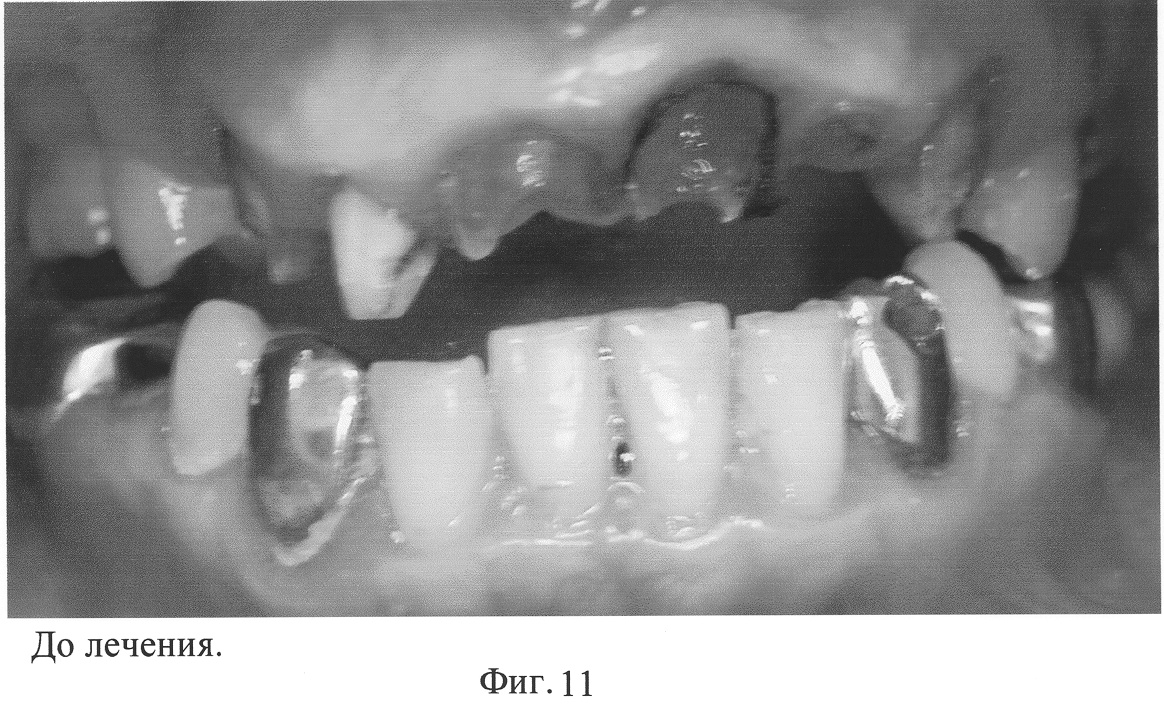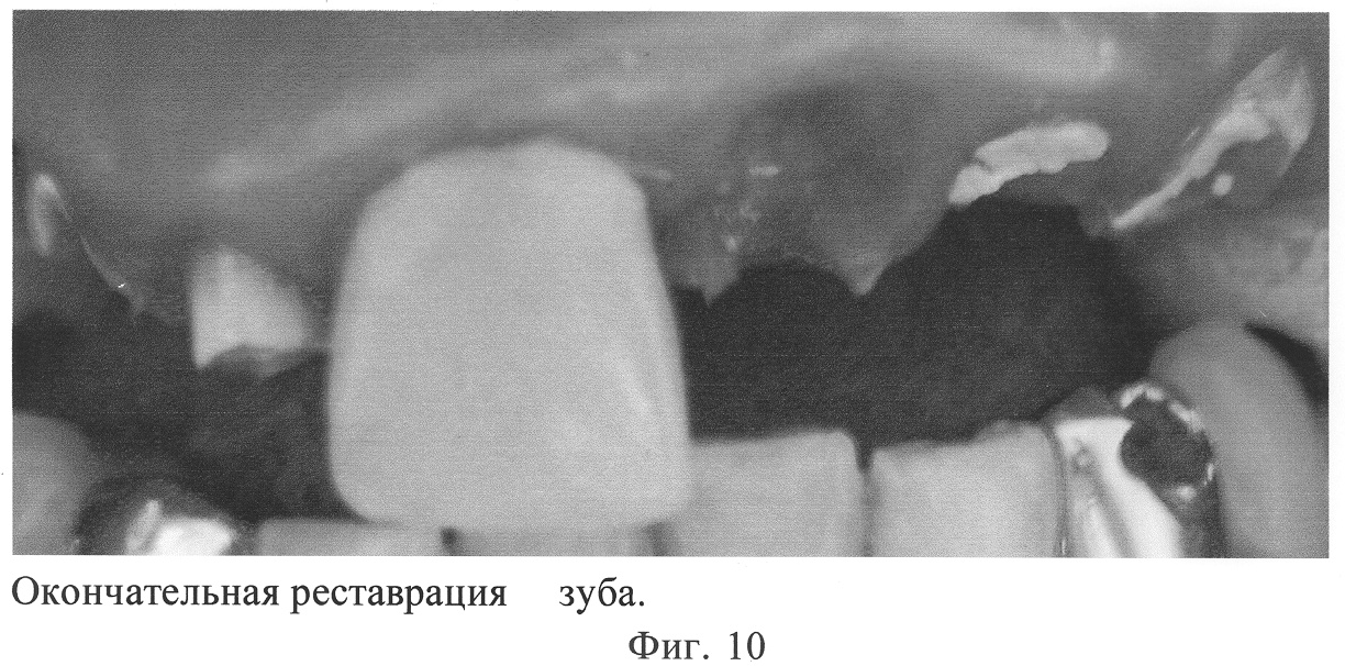 Предлагаемый способ (см. фиг.1-12) предполагает предварительное эндодонтическое лечение зуба. Корневой канал должен быть запломбирован на 1/3 длины корня и не иметь переапикальных изменений. Определяется цвет будущей реставрации по шкале VITA. Производится ретракция десны, ретракционной нитью для большего доступа к корню зуба. После ретракции десны на основании корня формируют полость.