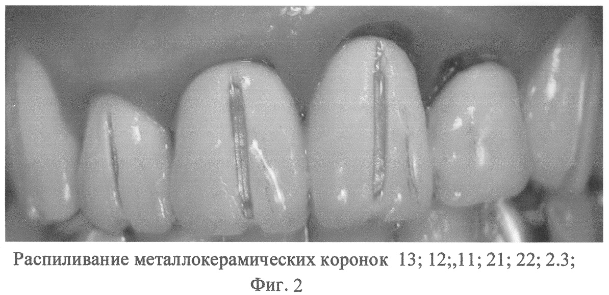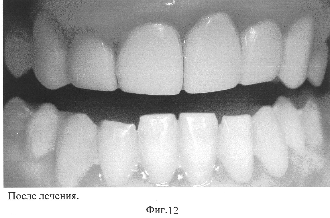 Эстетический эффект достигали после предварительной обработки и шлифовки стандартными полировочными дисками различной толщины и зернистости абразива, алмазными борами, а апроксимальные поверхности обрабатывали штрипсами. Окклюзионное редактирование проводили под контролем окклюзионной бумаги финишными борами, дисками. Удаляли ретракционную нить. Осложнений после проведения вышеуказанным способом выявлено не было.