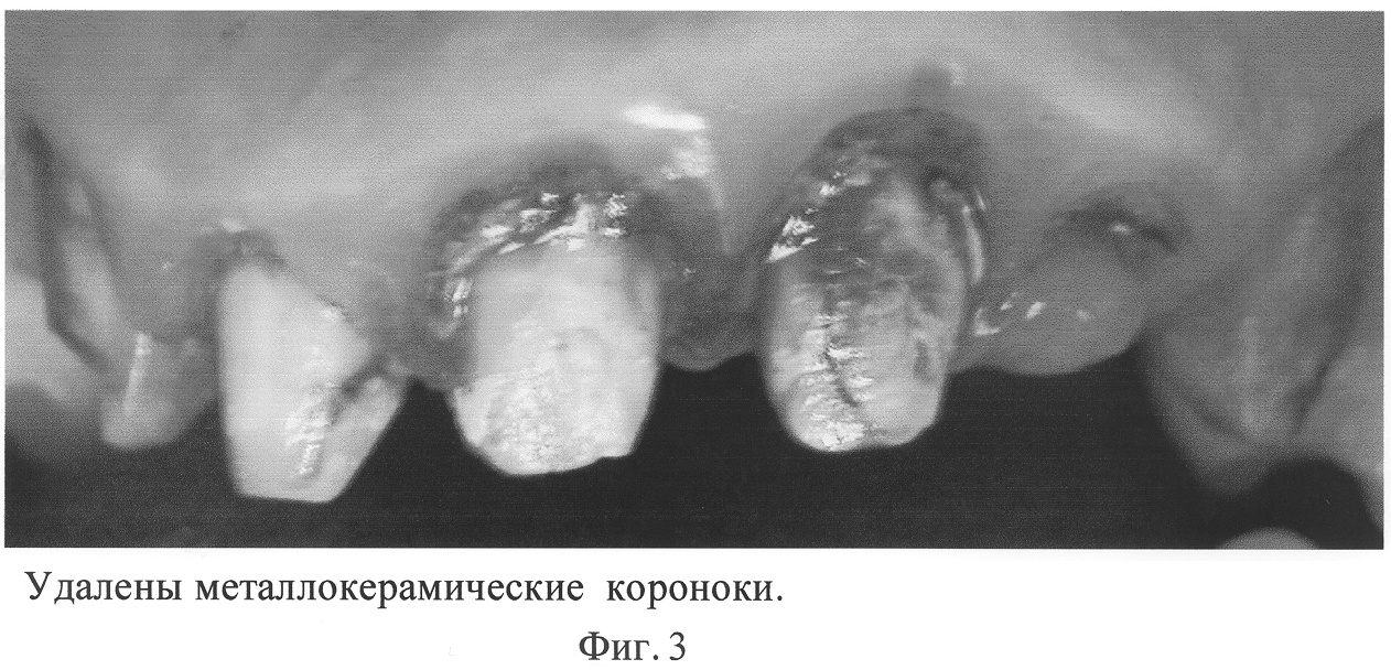 Лечение: Определяли цвет будущей реставрации по шкале VITA. Произвели ретракцию десны ретракционной нитью. После ретракции десны на основании корня сформировали полость. Армирующий штифт изготавливали из прямоугольной пластины, выполненной из металлической сетки. Из пластины формировали армирующую и фиксирующую части штифта. Противоположные стороны по длине пластины сближали друг относительно друга для придания пластине изогнутой формы. Ширина армирующей части штифта соответствовала ширине дефекта коронковой части отсутствующего зуба. Со стороны, противоположной армирующей части штифта, формировали ее фиксирующую часть. Для этого пластину изгибали дополнительно для придания ей формы, повторяющей форму полости, сформированной на основании корня.