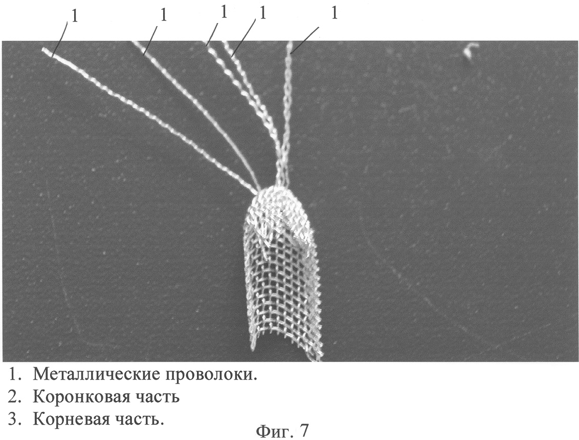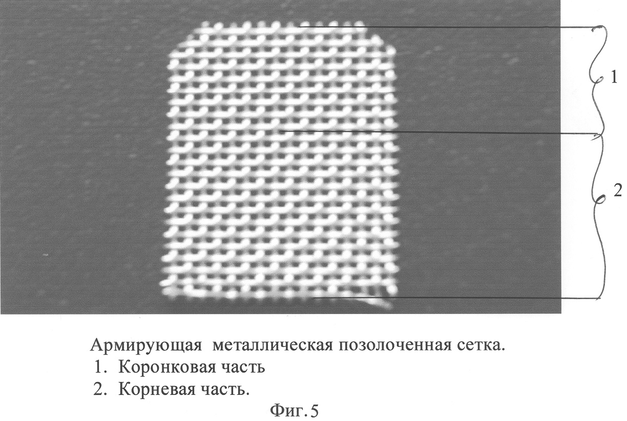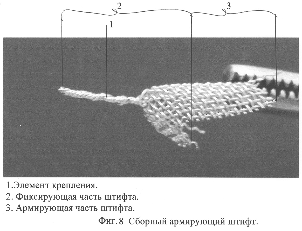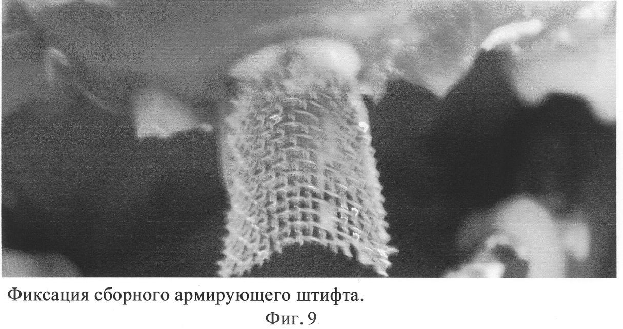 Металлическим нитям, которые могут быть, в частности, выкроены из сетки, придают “U”-образную форму. Свободные концы нитей пропускают через отверстия фиксирующей части штифта, предпочтительно по центру, и скручивают их между собой, жестко соединяя фиксирующую часть штифта и образованный таким образом элемент крепления. При этом длина элемента крепления, как правило, не превышает 1/2 длины корня зуба. Армирующая часть, фиксирующая часть и элемент крепления составляют сборный армирующий штифт. Затем осуществляют примерку сборного армирующего штифта. После примерки и коррекции производят кислотное травление основания корня для создания микрорельефа (при этом корневой канал закрывается ватой. Кислоту смывают струей воды при работающем слюноотсосе, полость высушивают воздухом, наносят адгезив, слегка продувают воздухом для равномерного распределения. Полимеризуют стандартным методом согласно инструкции. Далее удаляют вату из корневого канала и штифт фиксируют с помощью стеклоиномерного цемента, размещая в корневом канале элемент крепления, а в сформированной полости основания корня – фиксирующую часть штифта.