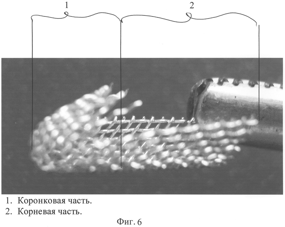 Металлическим нитям, выкроенным из сетки, придавали “U”-образную форму. Свободные концы нитей пропускали через отверстия фиксирующей части штифта, скручивали их между собой, жестко соединяя с фиксирующей частью штифта. После примерки и коррекции сборного армирующего сеточного штифта производили кислотное травление основания корня, при этом корневой канал закрывали ватой. Кислоту смывали струей воды при работающем слюноотсосе, полость высушивали воздухом, наносили адгезив, слегка продували воздухом для равномерного распределения. Полимеризовали стандартным методом согласно инструкции. Далее удаляли вату из корневого канала и штифт фиксировали с помощью стеклоиномерного цемента, размещая в корневом канале элемент крепления, а в сформированной полости основания корня – фиксирующую часть штифта.