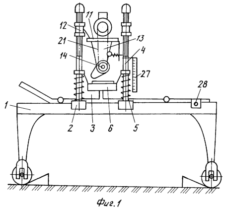 Ложе 3 с пациентом “г” заводят на раму 1 так, чтобы грудь была расположена под планкой 9 листа 7 грудной манжеты 6. Устанавливают требуемый эксцентриситет средства 16 для воздействия на грудную манжету 6 относительно оси 14. Для этого ослабляют винты 25 и перемещают средство 16 в требуемом направлении на необходимую величину эксцентриситета относительно оси 14. Затягивая гайки винтов 25, средство 16 плотно прижимают к диску 15. Величину эксцентриситета определяют экспериментально в зависимости от упругости грудной клетки пациента и возможного его дыхательного пути (вдох – выдох). Прикрепляют грудную манжету 6 на пациента “г” путем охвата тела с последующим соединением концов шнура 10. Положение рабочего органа относительно груди пациента “г”, при необходимости, можно установить путем поступательного перемещения кронштейна 11. Для этого ослабляют затяжку верхних (нижних) гаек 26 и перемещают кронштейн 11 в требуемом направлении (вверх или вниз) на требуемую величину. При этом втулки 12 передвигаются со скольжением по резьбовому участку направляющих 4. После чего положение кронштейна 11 фиксируют затягиванием гаек 26. Включением электроцепи задают вращение якорю электродвигателя 18, муфте 20, редуктору 19, звездочке 22, цепи 21, звездочке 23 и через ось 14 и диск 15 средству 16. При повороте средство 16 воздействует на планку 9 листа 7 манжеты 6, которая опускается и давит на грудную клетку пациента “г”. При этом благодаря телескопической связи втулки 8 скользят по гладкому участку направляющих 4 без поперечных колебаний, сжимают упругие элементы 5. Благодаря чему грудная клетка пациента “г” деформируется (сжимается), а значит работают на сжатие и легкие пациента “г”. Происходит выдох отработанного воздуха из организма. При дальнейшем повороте средство 16 сходит с планки 9 (с мертвой точки), упругие элементы 5 разжимаются и возвращают грудную манжету 6 в исходное положение, т.е. грудная манжета перемещается вверх. Освобожденная от нагрузки грудная клетка распрямляется. При этом происходит расширение легких, т.е. имеет место вдох свежего воздуха. Так происходит до восстановления дыхательного естественного процесса. Дыхательный объем определяется величиной сжатия грудной клетки. Меняя расстояние “е” передвижением средства 16 относительно оси 14 можно регулировать дыхательный объем от 0 до требуемого предела. При этом частота дыхания не изменится, так как время двойного хода грудной манжеты 6 (сжатие – расширение легких пациента) определяется временем оборота диска 15 оси 14, т.е. средства 16. Регулировка дыхательного объема производится путем перемещения по винтам 25 продолговатых щелей “а” средства 16 относительно оси 14.