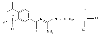 Настоящее изобретение относится к применению ингибитора натрий-водородного обмена в медицине и ветеринарии для уменьшения функциональных нарушений сердца в условиях ишемии и реперфузии, которые могут быть вызваны, например, сердечными ядами животного и растительного происхождения, лекарственными средствами с кардиотоксическим компонентом или с нежелательными побочными воздействиями на сердце и в результате постоянного или ударного введения в организм могут вызывать расстройства здоровья. Ингибиторы натрий-водородного обмена (NHE) в течение последних лет охарактеризованы в многочисленных доклинических исследованиях как вещества, наиболее пригодные при пониженном кровоснабжении сердца для защиты сердечной ткани от гибели. Защита сердечной ткани благодаря ингибиторам натрий-водородного обмена охватывает все формы вызываемых недостаточным кровоснабжением повреждений, начиная с нарушений сердечного ритма через гиперконтрактуру сердечной мышцы и временную потерю функции вплоть до отмирания сердечной ткани и связанных с этим устойчивых повреждений. Механизм действия ингибиторов NHE состоит в том, что они уменьшают усиленный приток ионов натрия, возникающий в недостаточно снабжаемых кровью тканях за счет активации NHE вследствие внутриклеточного подкисления. Благодаря этому замедляется перегрузка ткани натрием. Так как в сердечной ткани транспортировка ионов натрия и транспортировка ионов кальция связаны друг с другом, таким образом предотвращается также угрожающая жизни перегрузка кальцием клеток сердца. Действие ингибиторов NHE, как уже описано выше, направлено на устранение и уменьшение повреждений, которые происходят вследствие ишемии, по существу из-за отсутствия или недостатка снабжения сердца кислородом и питательными веществами. Поэтому оказалось неожиданным, что с помощью ингибитора NHE можно также предотвращать или уменьшать повреждения, возникающие за счет присутствия веществ с кардиотоксическим потенциалом. При этом речь может идти о природных или синтетических ядах с кардиотоксическим компонентом, таких, как змеиные яды, токсины рыб, жгучие яды морских медуз, яды скорпионов или пауков и т.д. Важным является применение ингибиторов NHE при лечении острых хронических заболеваний, используемая до сих пор при этом терапия ограничена кардиотоксичностью вводимых лекарственных средств. Комбинированное применение при этом можно осуществлять в форме отдельных веществ или в виде определенной комбинированной композиции. К такого рода показаниям в отношении лекарственных средств, использование которых характеризуется кардиотоксическими побочными действиями, относится применение ингибиторов NHE в сочетании с гормонами щитовидной железы, такими, как тироксин и трииодтиронин. Это также относится к применению ингибиторов NHE в сочетании с антихолестеринемическими лекарственными средствами, которые химически и фармакологически являются производными гормонов щитовидной железы, как, например, тиропропиковая кислота. Логическим следствием этого является использование ингибиторов NHE для лечения гиперфункции щитовидной железы, при которой высокий уровень выделяющихся гормонов щитовидной железы, как известно, ведет к поражениям сердца. Особое значение имеет применение ингибиторов NHE в терапии р
