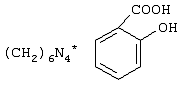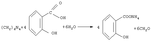 Изобретение относится к ветеринарии, а именно к ветеринарной фармации, в частности к ветеринарным препаратам для лечения желудочно-кишечных заболеваний у молодняка сельскохозяйственных животных и птиц. Известно применение в ветеринарии при лечении инфекционных заболеваний пищеварительного тракта салициловой кислоты путем внутреннего введения (см. И.Е.Мозгов. Фармакология, 1979, с.86-87). Недостатком препарата является ограниченный диапазон лечебного действия, сильное раздражающее действие кислоты на рецепторы чувствительных нервов, которое ведет к значительному изменению тканей, вплоть до воспаления. Также известно применение в ветеринарии гексаметилентетрамина при лечении различных заболеваний сельскохозяйственных животных (см. Фармакология, 1979, с.304-305). Недостатком этого препарата является его медленное расщепление в организме животного на формальдегид и аммиак, которые главным образом и обладают терапевтическим действием. Техническим решением задачи изобретения является повышение эффективности лечения желудочно-кишечных заболеваний молодняка путем расширения диапазона и усиления терапевтического действия препарата (противовоспалительного, бактерицидного, фунгицидного, стимулирующего регенеративные процессы и эвакуацию воспалительного экссудата из организма), а также исключения отрицательного побочного влияния. Поставленная задача достигается тем, что препарат для лечения желудочно-кишечных заболеваний и расстройств у молодняка сельскохозяйственных животных и птиц, содержащий гексаметилентетрамин, дополнительно содержит салициловую кислоту при следующем соотношении компонентов, мас.% гексаметилентетрамин – 44-55; салициловая кислота – 44-55. Новизна заявленного препарата обусловлена тем, что настоящее лекарственное средство, включающее сочетание салициловой кислоты и гексаметилентетрамина со следующей химической формулой: предназначенного для наружного и внутреннего применения, исключает раздражающее действие, не оказывает токсического и других отрицательных побочных влияний, оказывает комплексное этиотропно-патогенетическое лечебное действие. В частности входящий в состав препарат гексаметилентетрамин нейтрализует токсическое и раздражающее свойства салициловой кислоты, увеличивает выделение в организме животного молекулярного формальдегида: Нейтрализация токсических и раздражающих свойств салициловой кислоты гексаметилентетрамином и активизации последнего позволило применять предложенный препарат как местно при лечении разного характера ран, так и внутрь при лечении заболеваний пищеварительного тракта животных инфекционного и незаразного происхождения. По данным научно-технической и патентной литературы, обнаружена аналогичная совокупность признаков, позволяющая решить поставленную задачу, что позволяет судить об изобретательском уровне заявленного технического решения. Что касается критерия “научная применяемость”, то входящие в состав препарата компоненты допущены Госфармакопеей (ГФ 11) к использованию в медицинской и ветеринарной практике. Указанные компоненты присутствуют в организме в течение суток после завершения лечения, что указывает на возможность изготовления препарата промышленным способом. Заявленный препарат – это комплексное соединение, п