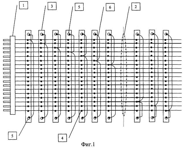 Электродное устройство подсоединяется к многоканальному электронейроадаптивному стимулятору с помощью стандартного разъема 1. Благодаря наличию плоского многожильного гибкого кабеля 2 обеспечивается плотное прилегание электродного устройства к объемной и протяженной зоне воздействия. Разъемное соединение электродов 7 с плоским многожильным гибким кабелем 2 позволяет изменять число активных электродов и отсоединять их для санитарно-гигиенической обработки.