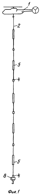 При объявлении тревоги бухту 19, всегда хранящуюся на определенном месте, берут и навешивают на карабин 10 лебедки 12 свободного вертолета, готового к полету. Бухта всегда должна быть подготовлена к навеске, для чего после каждого использования устройства канат наматывают на вспомогательный цилиндр 18 с предварительно растянутыми петлями 3. После этого цилиндр 18, надетый на корпус контейнера, из бухты 19 вытягивают, и бухту, для сохранения ее формы и для прикрепления к контейнеру за крючки 20, обвязывают в нескольких местах лентой. При подлете к объекту выключателем 17 подают электропитание, кольца ленты разрезают или распускают быстро развязывающиеся узлы ленты и устройство сбрасывают с вертолета, при этом опасного рывка каната от легкого контейнера не следует. При необходимости, если на конец каната приходится закреплять дополнительный груз, рывок каната может быть смягчен лебедкой 12.