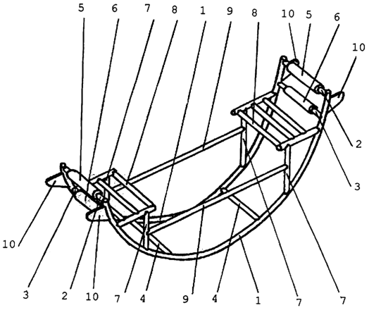 Одни поперечины 4 расположены в нижней части дугообразных элементов 1, другие 2, 3 – в верхней части, верхние 2 из них несут рукоятки 5, установленные с возможностью их свободного вращения вокруг продольной оси, нижние 3 несут рукоятки 6, установленные неподвижно.