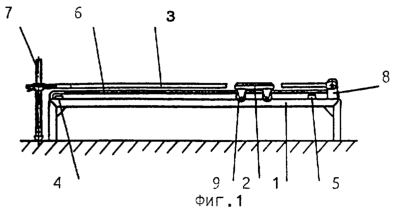 Направляющие 3 установлены под острым углом по отношению к продольной оси основания 1 за его пределами и с обеспечением возможности свободного размещения ног при их разведении с внешней стороны направляющих 3.